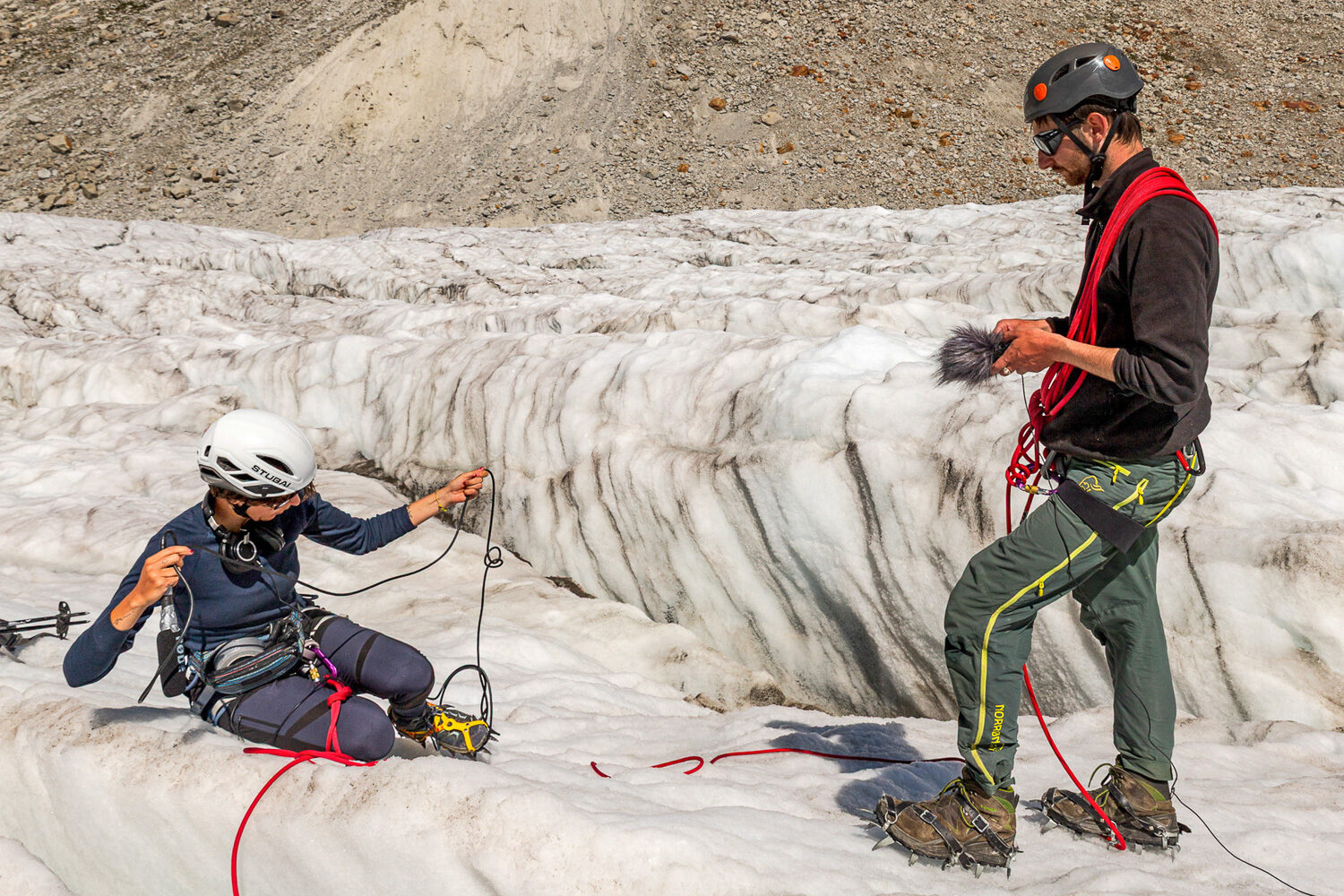 (Aline Stadler): In eurem Feature «Klänge des Anthropozän» habt ihr schmelzende Gletscher und bröckelnde Berge akustisch eingefangen – und damit die Klimakrise als Hörerlebnis erfahrbar gemacht. Was reizte euch an dieser sinnlichen Herangehensweise?