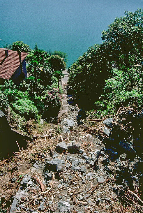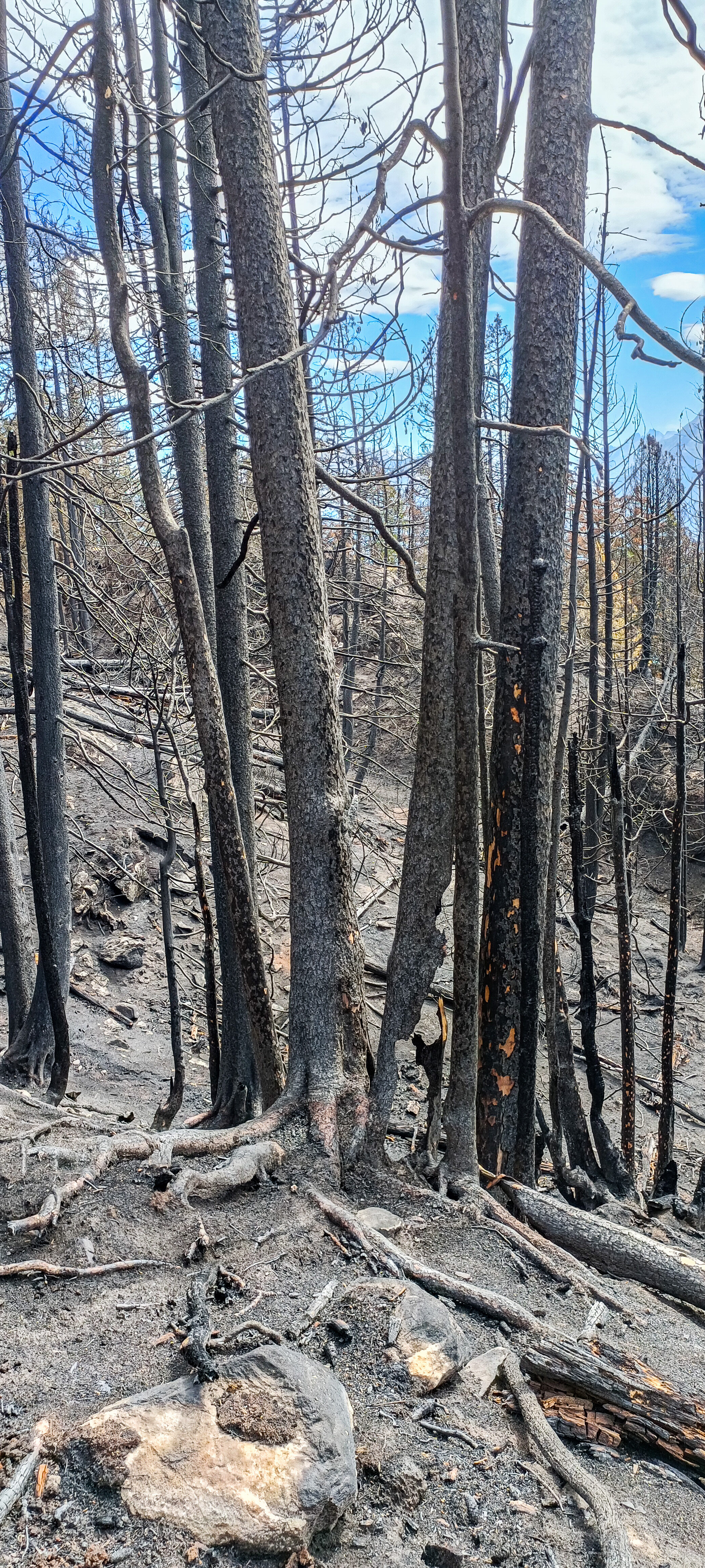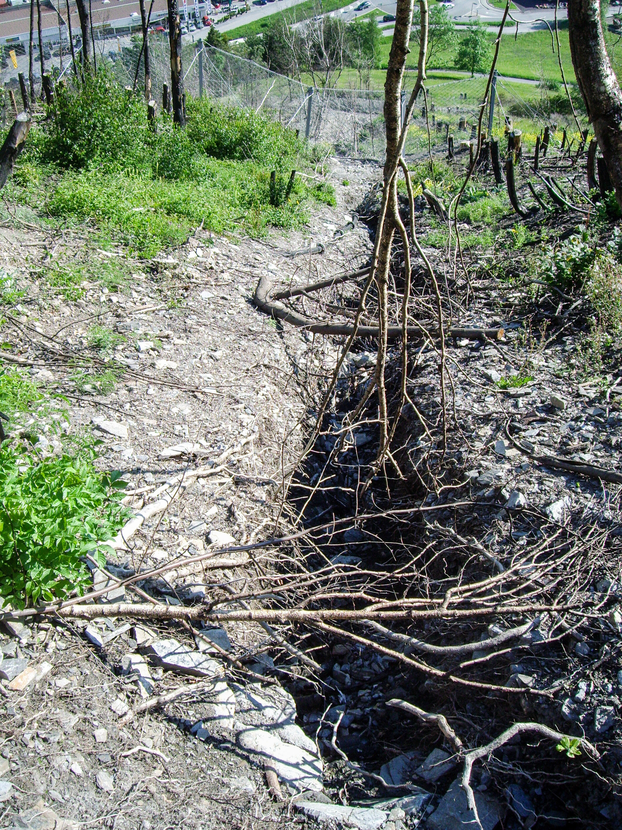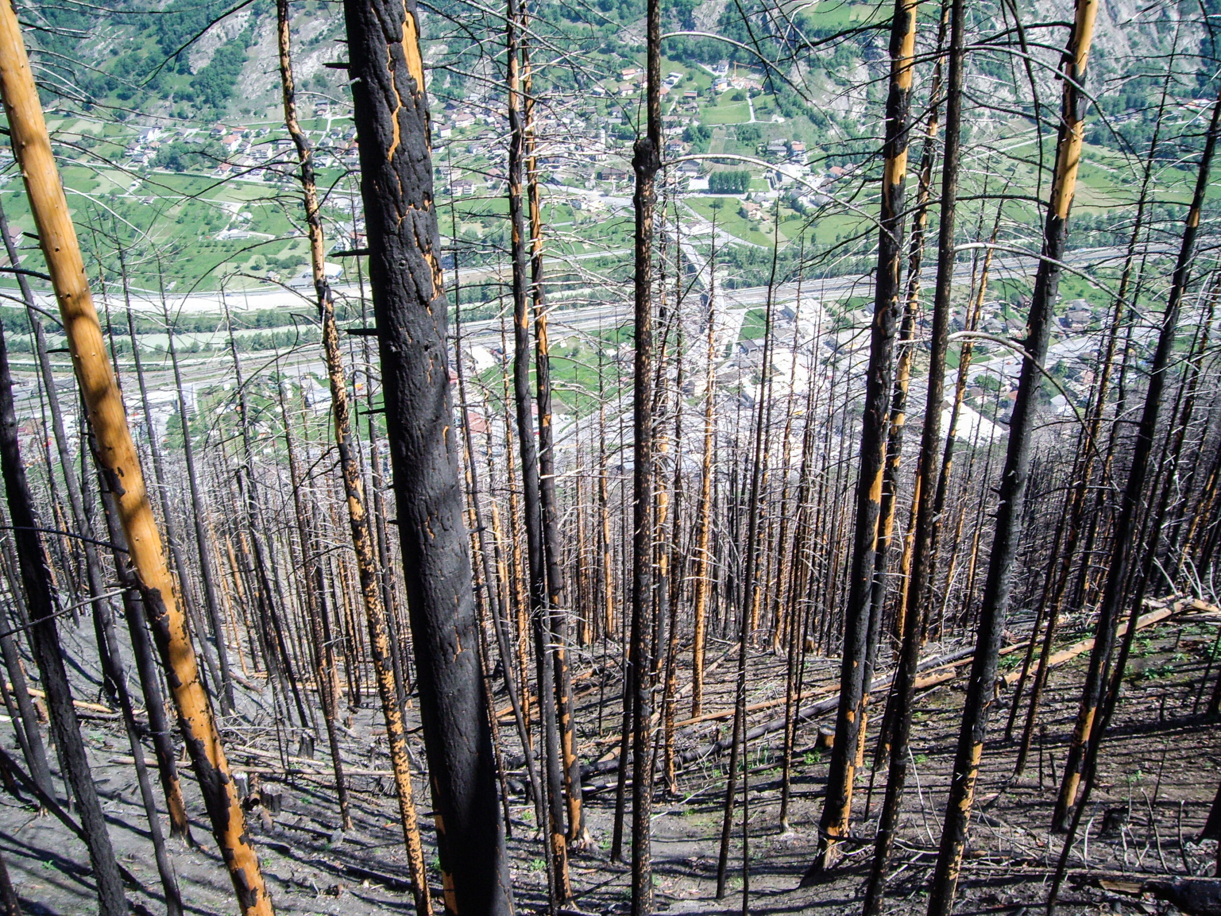 Hier kommen die Pflanzen ins Spiel: Wenn nach einem Brand die Boden- und Baumvegetation fehlt, prallen Regentropfen direkt auf den nackten Mineralboden. Dadurch werden Bodenstrukturen zerstört und Erosion und Auswaschung herbeigeführt. Diese negativen Auswirkungen eines Waldbrandes zeigen sich nach den ersten Wochen und Monaten. Bei Starkniederschlägen kann es zu Grabenerosion (Abb. 2) oder in extremen Fällen sogar zu Murgängen kommen (Abb. 3). Sind die Bäume stark beschädigt, beginnt – je nach Verletzungsgrad – ein langsamer oder rascher Sterbeprozess (Abb. 4). Die Lücken, die durch die toten oder zusammenbrechenden Bäume entstehen, werden von einer neuen Baumgeneration besetzt. Diese natürliche Waldsukzession nach einer Störung kann im Fall von Schutzwäldern vorübergehend zu einem Schutzdefizit führen und Steinschlag oder oberflächige Rutschungen ermöglichen. In Visp beispielsweise entstand ein allmähliches Verrotten der Wurzeln der toten Bäume nach dem Waldbrand von 2011, wodurch die Festigkeit des Bodens nachliess. Im Januar 2018 führte starker Regen zu oberflächigen Rutschungen und schliesslich zu einem Murgang.