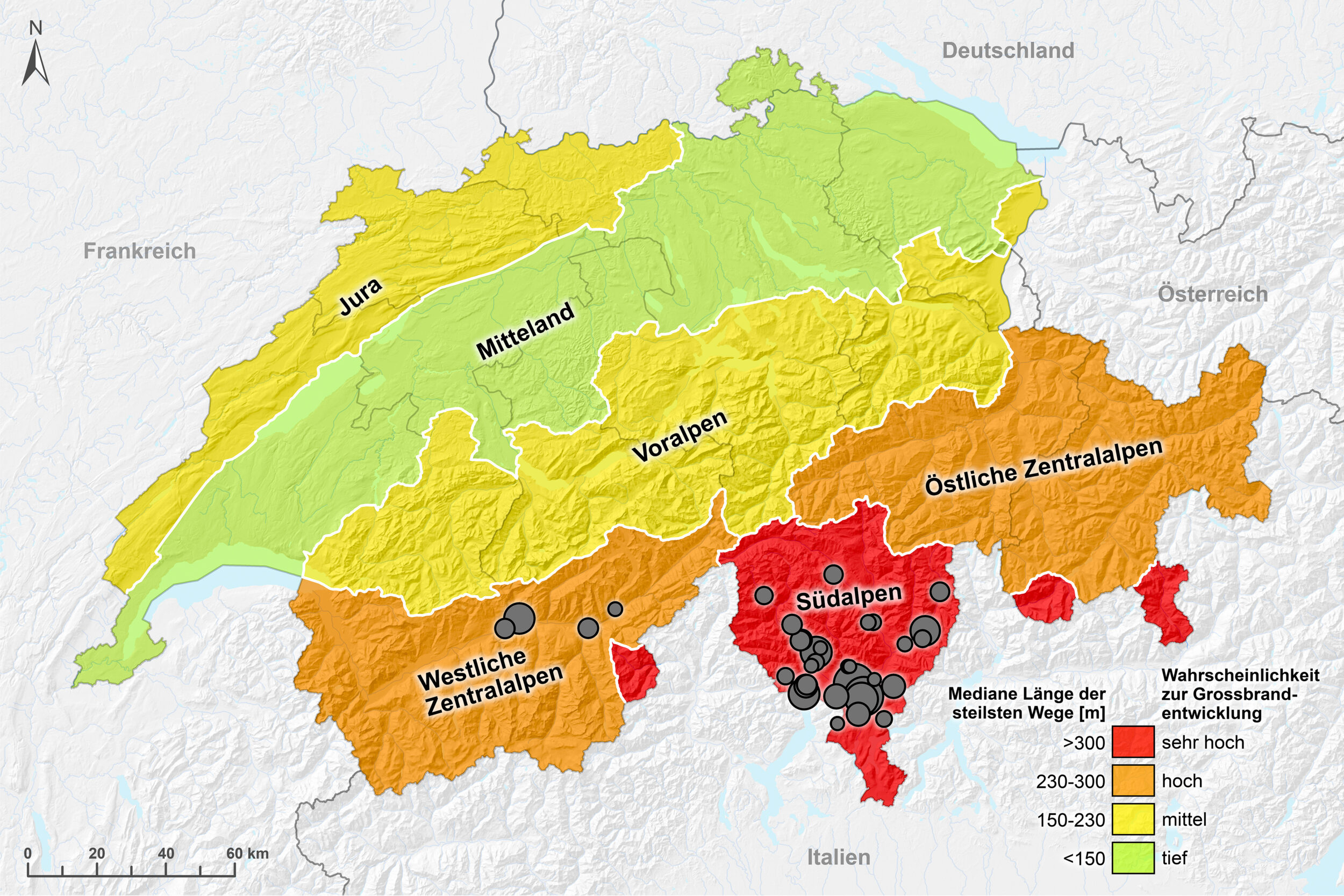 Diese landschaftlichen Gegebenheiten, kombiniert mit der Häufigkeit brandbegünstigender Wetterlagen, führen zu einer höheren Wahrscheinlichkeit für Grossbrände, wie in der Graphik 1 zu erkennen ist. Auf der Alpensüdseite und in den Zentralalpen treten solche Grossbrände am häufigsten auf. Trotz ähnlicher topografischer Bedingungen sind die nördlichen Voralpen aus klimatischen Gründen hingegen weniger stark betroffen als der Jura.